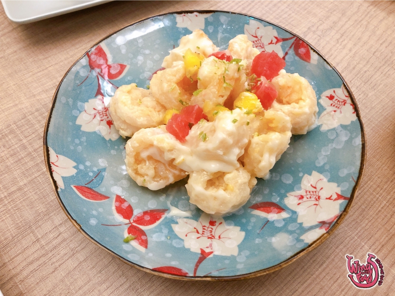 第六道「 柚柚蝦球 」,帶點柚香味的調味蝦球,外皮酥脆,即使冷掉也蠻好吃的!