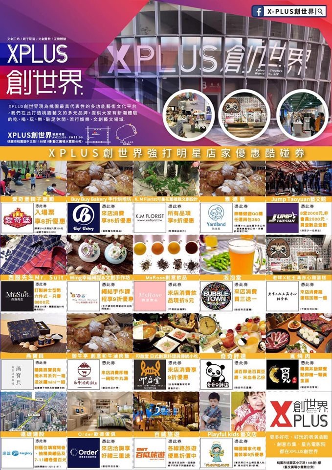 「X Plus創世界」位於桃園藝文特區的展演中心內,運用部份一樓展場空間,結合親子樂園、美食餐飲、娛樂生活、手作文創、音樂舞蹈等的多元藝文商場,籌備了一年、試營運了一個月,終於在2019/10/26(六)的這天正式開幕,搭配館內展演活動、周邊市集推廣,期待這個新創商場能將桃園的文化創意和在地生活推廣到全國,作為桃園文創及流行的新地標。