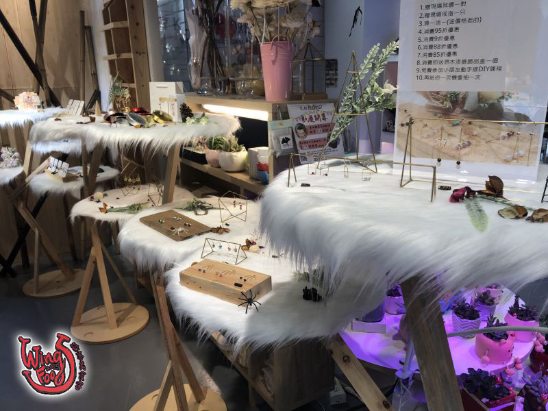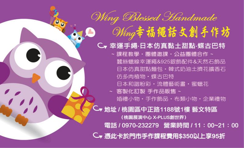 跟Wings同名耶!就感覺額外親切呢!「幸福」就藏在簡單的生活裡,有時候幸福也可以很簡單,他們的吉祥物是貓頭鷹(幸福鳥),店內有多款不同編法的蠶絲蠟線祈福幸運繩、925銀&水晶天然石設計款手鍊,都可以客製化尺寸和挑選喜歡的顏色、日本仿真甜點麵包、韓式奶油土擠花擴香石、仿多肉植物、蝶古巴特、蜜蠟花等手作商品,也提供課程教學、團體邀課、公益團體合作。