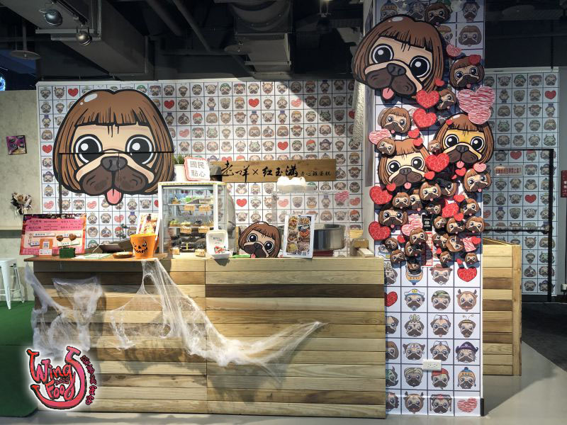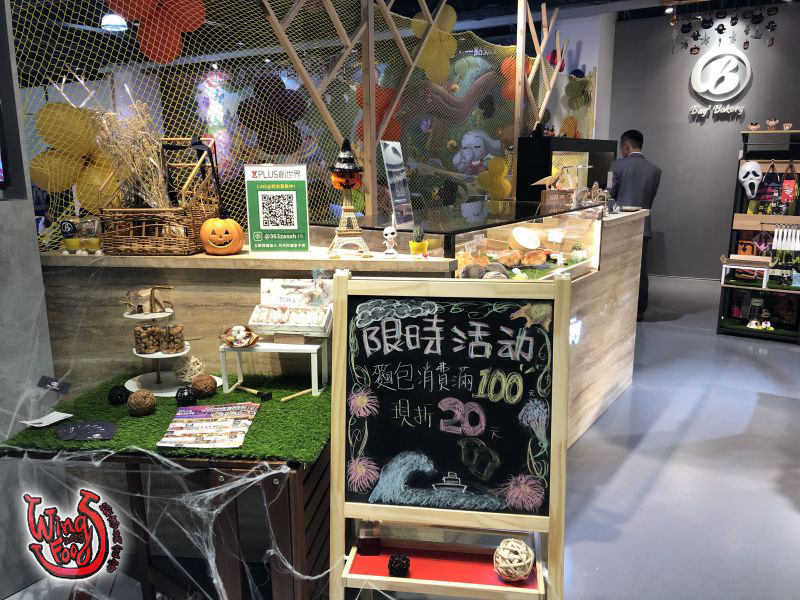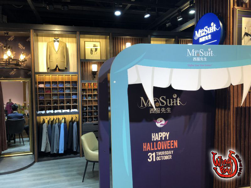 入口進來的左手邊就是服務台、和電梯的位置,週圍牆上有許多以十月份「萬聖節」為主題的背板可以拍照呢!