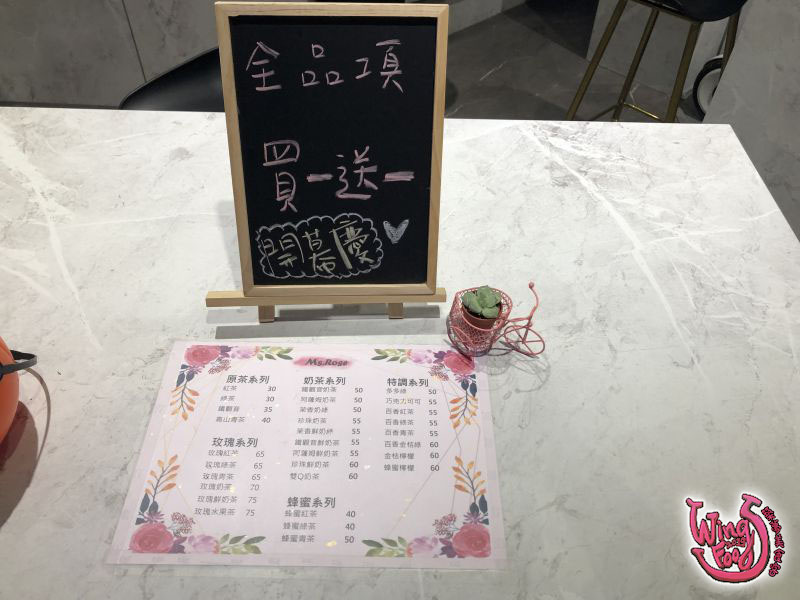 開幕當天去連招牌都還沒做好,可能是剛進駐,店家很推薦「玫瑰系列」,Wings買了玫瑰綠茶、玫瑰青茶(開幕當天每一送一),玫瑰香味很重,吸管是用紙吸管,價位蠻平價的,最便宜$30、最貴也才$75,可以去試試看喔!