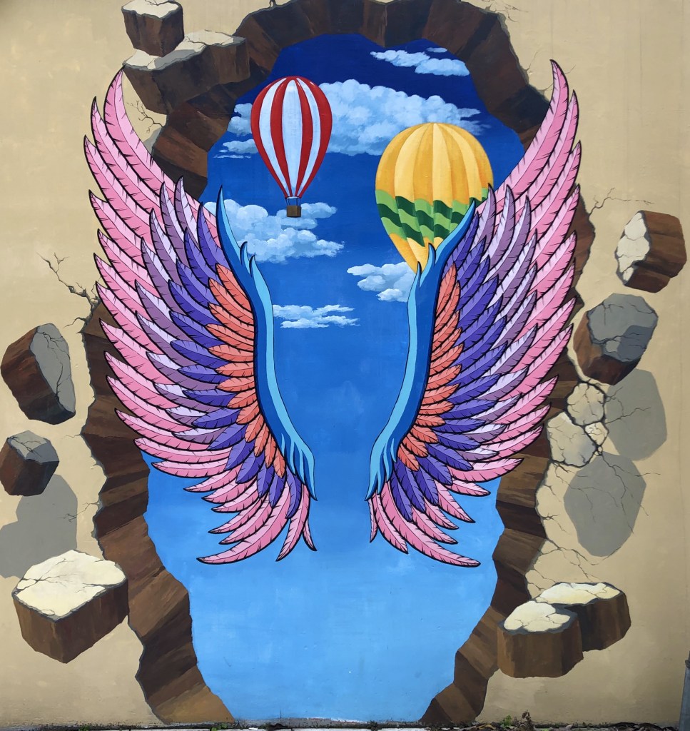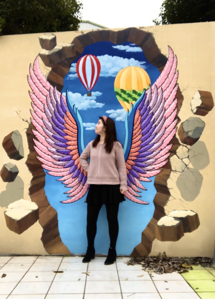 蒐藏散落各地的翅膀,2020/02/09第21對翅膀,連三天的翅膀消息,豐富了我的生活趴兔,從老街的停車場步行約15分鐘,走到比較偏的永福宮前面的廣場,有幾個互動的彩繪牆很逗趣,這對翅膀很直又很大,有熾天使想跳脫什麼的感覺~分享給大家。