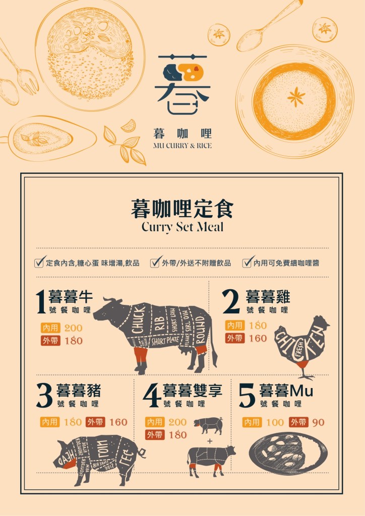 ◎店家賣什麼餐點:各式咖哩,暮暮牛、暮暮雞、暮暮豬、雙享、蔬食咖哩、或清咖哩。