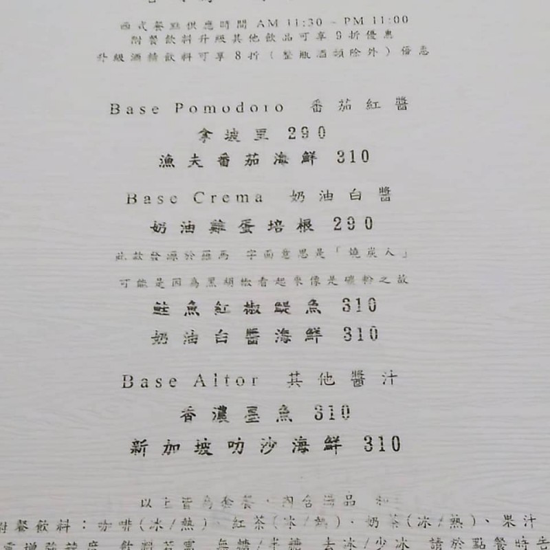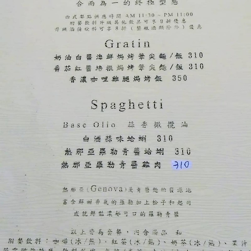 ●義大利麵和焗烤系列:1.海鮮焗烤飯/麵 2.培根焗烤飯/麵 3.咖哩雞腿焗烤飯 4.白酒蛤蜊麵 5.青醬蛤蜊麵 6.青醬雞肉麵 7.漁夫海鮮麵 8.白醬海鮮麵 9.鮭魚紅椒鯷魚麵 10.墨魚麵。