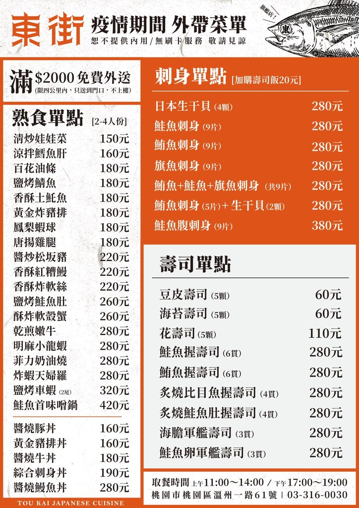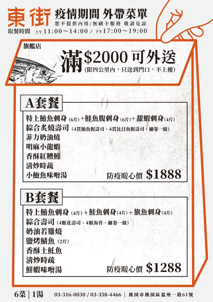 大家午安!東街日本料理桃園旗艦店開放外帶取餐囉!今天有興趣的人可以先下手預約訂單!我們有A套餐方案,也有B套餐方案、還有單點的選擇!在家裡就可以直接吃到生魚片和壽司了!人生極大享受!不想騎車/開車出門取餐沒關係!我們特地開放滿兩千免運外送到府(外送員不上樓!)沒有滿兩千也可以付運費外送喔!不能外出用餐的時候,東街替您準備多樣小吃外帶,美味方便又安心安全!讓我們一起守護台灣、守護我們的家園!