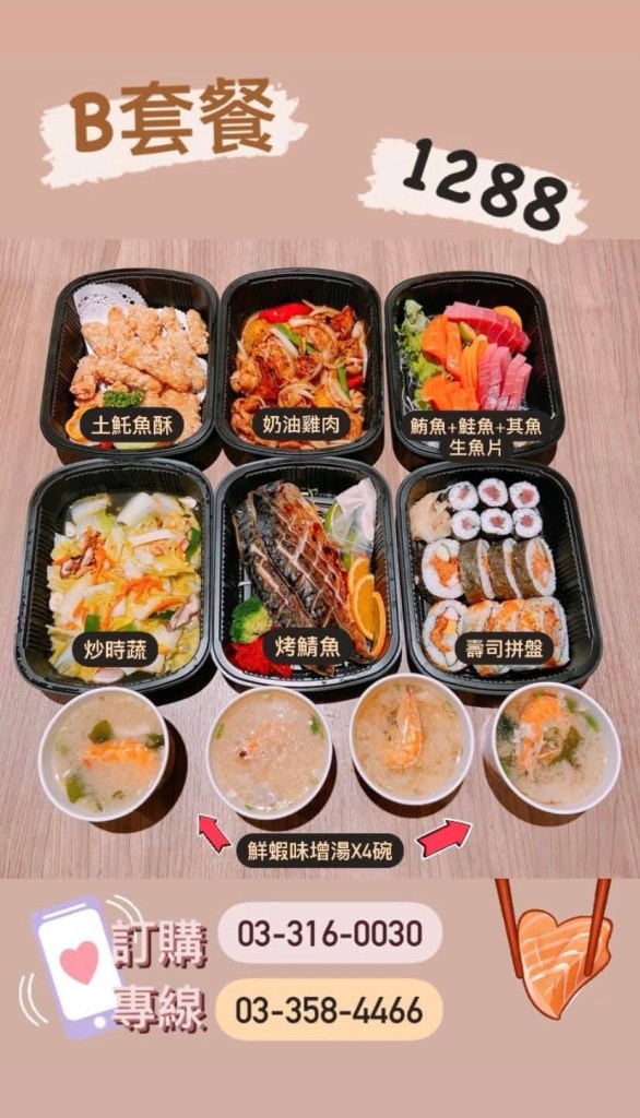 ●B套餐$1288=土魠魚酥、奶油雞肉、生魚片、炒時蔬、烤鯽魚、壽司拼盤、鮮蝦味增湯4碗。