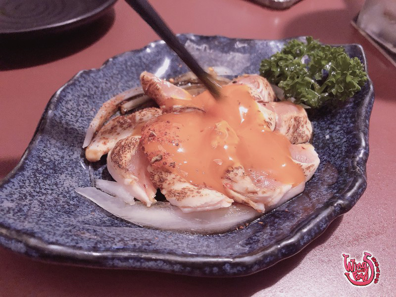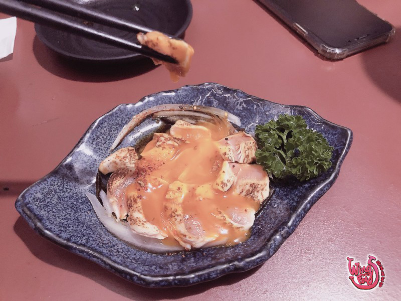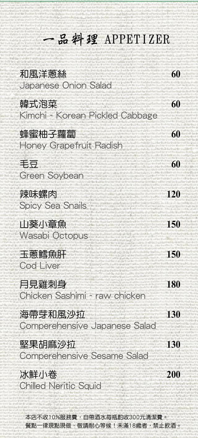 接著要來點點下酒菜!看了看菜單,第一頁的一品料理….除了「山葵小章魚」和「冰鮮小卷」是我們想吃的以外,店家推薦「月見雞刺身」,使用「桂丁雞」吃起來像生魚片的口感,聽完介紹才知道「桂丁雞」是用在「國宴料理」等級的好食材,在桃園很少店,會進這類食材做下酒菜~難得…((聽到這~這還不給他怒吃一波XD!!))