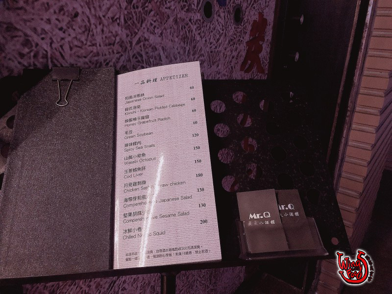 輕鬆的和老闆聊著聊著,最讓Wings覺得很了不起的地方是,老闆很年輕才80年次,就很有自己的想法和做法,每道料理都花了很多心思下去變化,樂於分享的他們,把客人當做家人抑或朋友般的暢談交流,另外,去小解的Wings在廁所發現店家的貼心之處,有準備漱口水、女用棉棉、牙籤線等等的小物,老闆娘說:「因為自己會忘記,所以幫客人準備!」真是好一個,「想到自己之前先想到他人」的服務理念。在Wings要離開時,店內居然快做滿,所以Mr.Q是一家愈晚愈熱鬧的店喔!