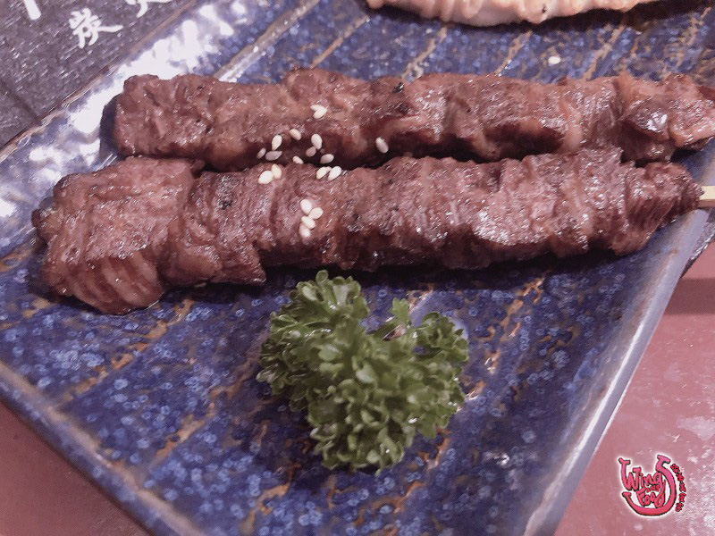 也點了好幾種串串和烤物!熱情的老闆娘說老闆掌廚很講究火侯,對自己的「串烤物」很有信心,所以店內沒有賣炸物,都專注於烤物上,於是我們點了好幾種來吃吃看,那個大蒜卷、番茄卷、牛肋條、雞膝軟骨、雞菲力、很特別的墨魚腸….都來!都來!其中,「和牛橫膈膜」,他們說是極品中的極品,吃過都說會想念、吃過了就回不去了~~這不吃吃看怎麼行呢?!雖然那價格….有點高…但就給他點下去吧!美食當前吃飯皇帝大!XDDD