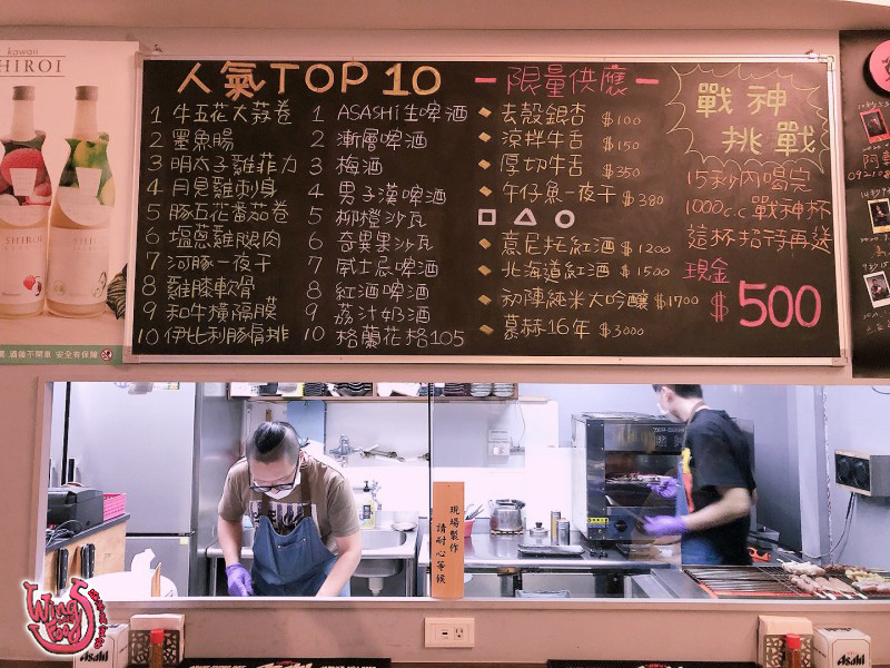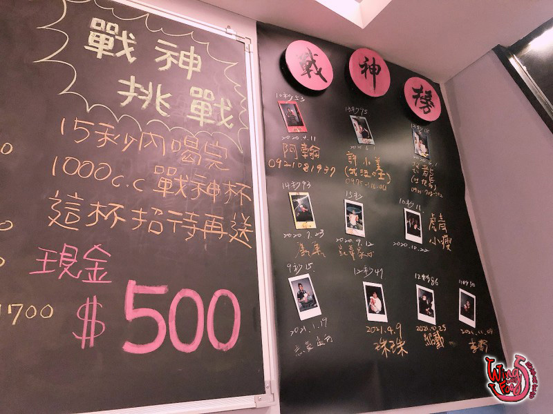 等餐的同時,赫然發現另外一片廚房牆上,剛剛點的很多都是人氣前十名的餐點!水啦!還發現店家原來有「戰神挑戰」這有趣的喝啤酒挑戰,只要在15秒內喝1000CC戰神杯,這杯店家招待外,再送上現金$500!哇賽~~店家也太佛心了吧!根本招待喝又招待吃阿!這好康~趕快叫友人挑戰看看!但友人不敢挑戰~~怕喝飽就吃不下我們點”這麼多”的食物了!我就吐槽他說:「是怕15秒內喝不完吧!」我們就互看哈哈大笑~~~~